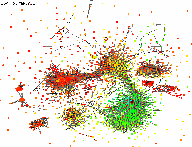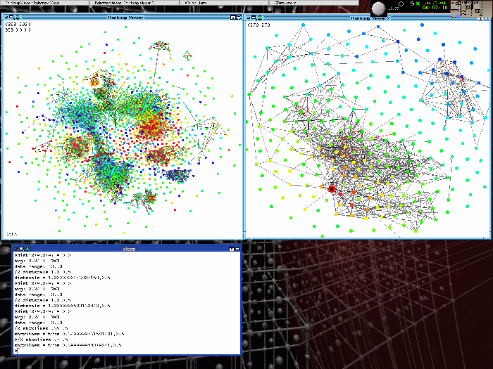 Clustering gene expression data involves identifying genes that have similar expression patterns over a variety of experiments. Traditionally, such clustering assigns a discrete cluster label to each gene. We are investigating clustering methods based on multidimensional scaling. In this method, genes are assigned coordinates in a low-dimensional space in such a way that genes with similar expression patterns are assigned places close to each other. Applied in two dimensions, this creates a planar map in which clusters can be visually identified and relations between clusters investigated interactively. By using this method both to map genes and experiments, we are looking for characteristic patterns in gene expression data that can serve as input to network inference applications. We use a numerical method using different distance kernels to obtain a map that represents a chosen correlation measure between genetic expression profiles. By choosing different correlations measures, data subsets, and distance kernels, we can focus on different aspects of the data. The optimization of the map is done either using a gradient-descent algorithm or with a hybrid molecular dynamics Monte Carlo algorithm. To avoid jamming, the minimization takes first place in a higher-dimensional space, which is then reduced by applying an external field to the data points. Once the data is mapped to the plane, we employ supervised-learning approaches to describe to properties of the mapping. The optimization process of the mapping is a self-organization process in which the algorithm identifies a set of features in the data that can be well represented in the plane. This features set can be extracted by considering the information entropy of the map, rule-based location assignment of the points, and local prototypes. →Presentations and publications